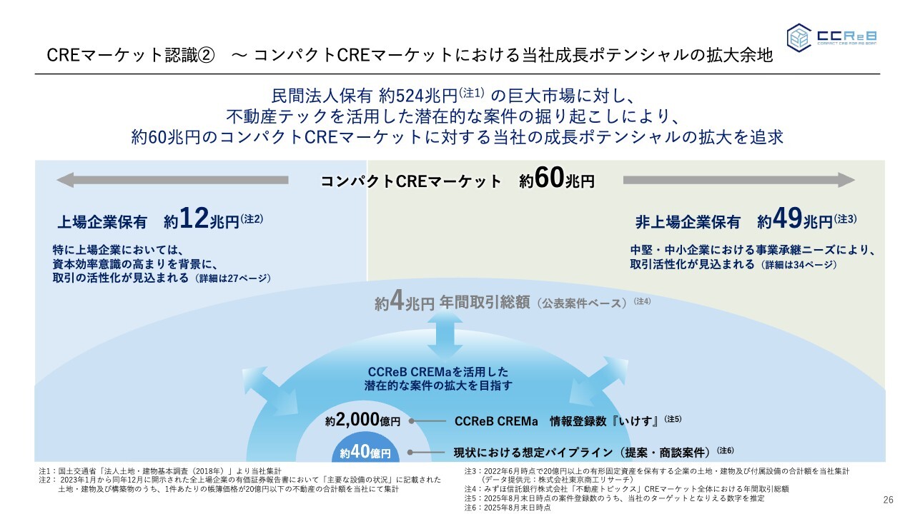 その中で、現在「CCReB CREMa」におけるポテンシャルとして、当社が取り組めそうな案件の総額は約2,000億円と見積もっています。そして現在進行中のパイプライン案件は40億円規模となっています。