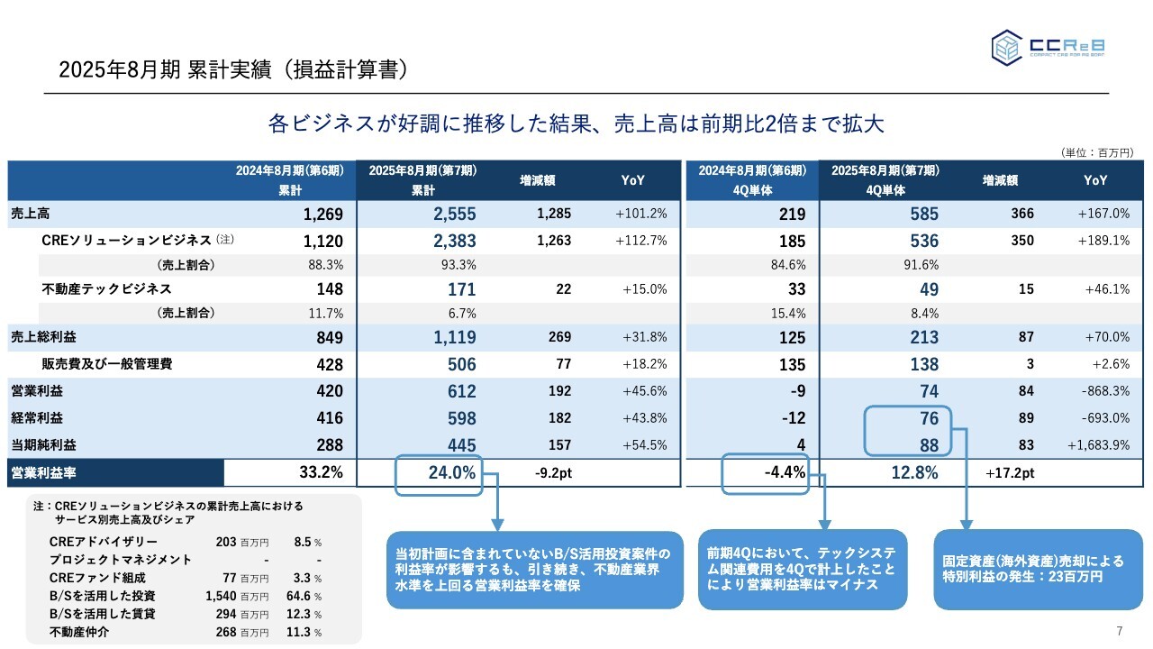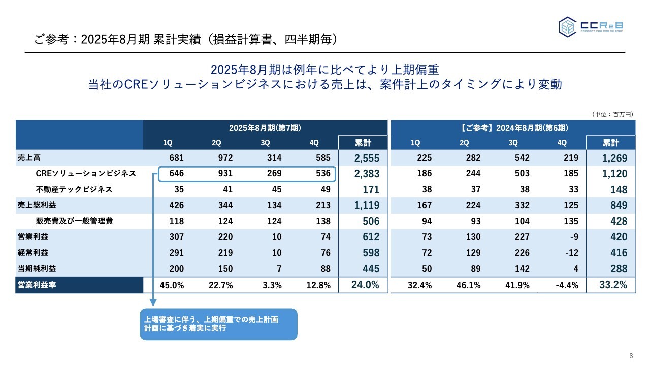 2025年8月期(第7期)については、上場後、最初の第1四半期で1回目の業績予想修正、第3四半期で2回目の修正を行いました。その修正の背景には、CRE案件のパイプラインが非常に増加している状況があり、この中で着実に案件を獲得していった1年だったと考えています。