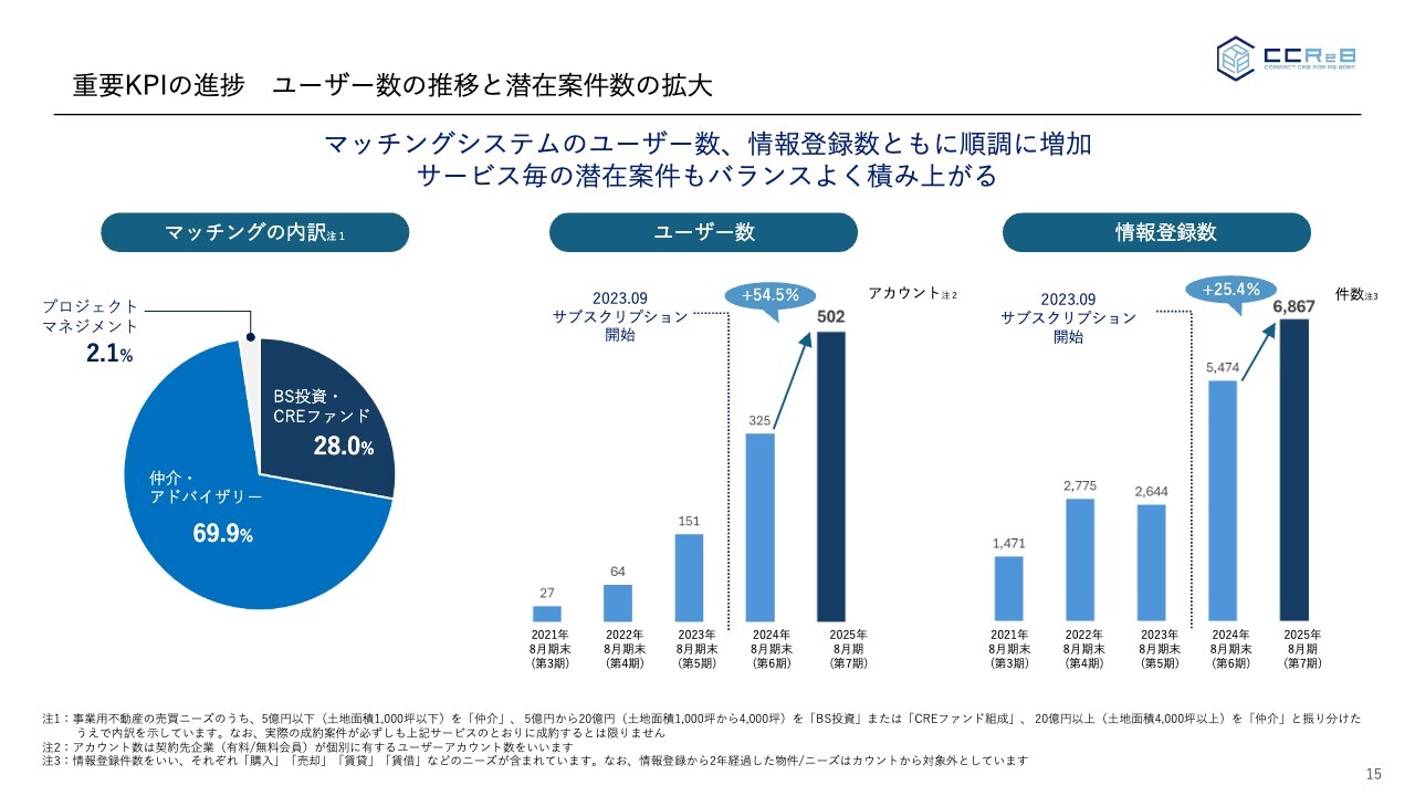 重要KPIである「CCReB CREMa」のマッチング状況についてお話しします。ユーザー数と情報登録数は順調に伸びています。サブスクリプション開始前ほどの急激な伸びではありませんが、当社が意図していたユーザー数の増加と物件登録、いわゆる「いけす」の拡大につながっていると考えています。