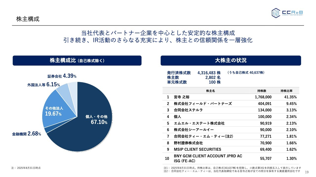 最後に株主構成についてご説明します。上場後、2025年8月末現在の株主構成はスライドのとおりです。ここでお伝えしたいのは、機関投資家が株主として入ってきていることです。