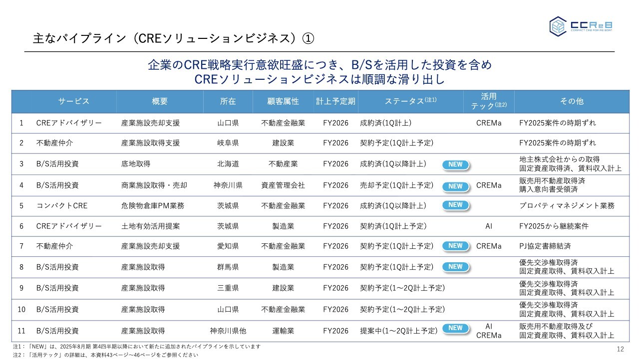 足元の事業進捗として、パイプラインを掲載しています。個別の説明は割愛しますが、結論として、パイプラインが大幅に増加しています。これはIPOしたことによる知名度の向上や、企業側における資本効率向上を目的とした不動産売却案件の増加といったマーケット環境の影響で、当社の仕事が非常に増加しているためです。