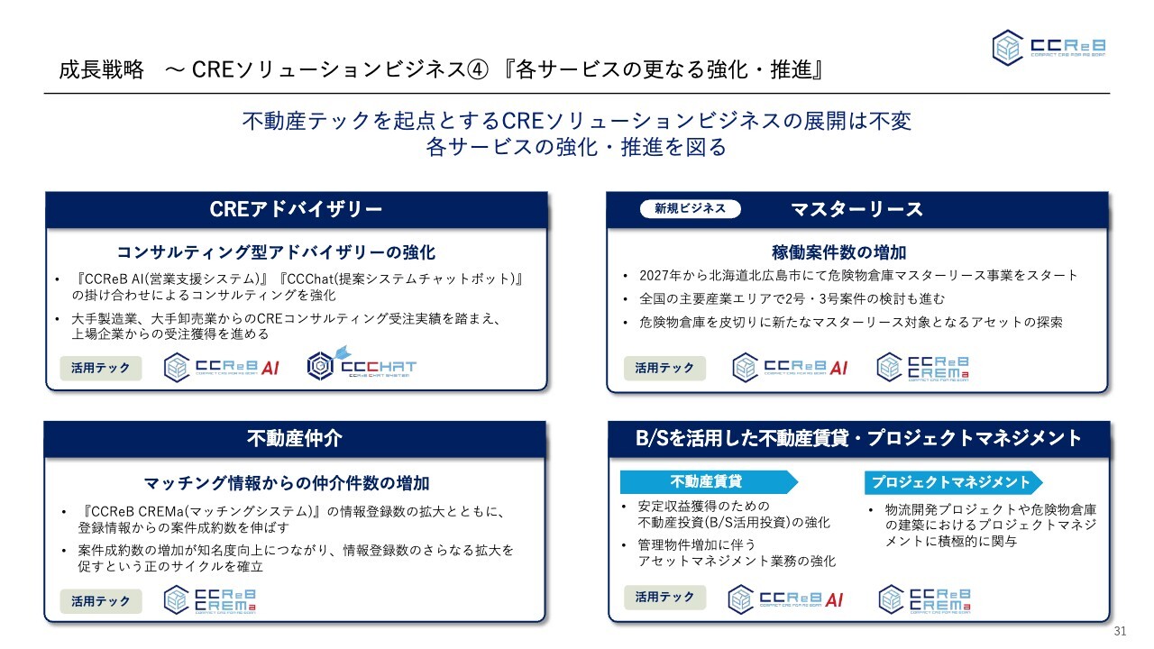 各サービスのさらなる強化・推進についてです。まずCREアドバイザリー事業においては、よりコンサルティング型のアドバイザリーを強化していく計画です。すでに大手製造業や大手卸業のCREコンサルタントの受注を受けています。