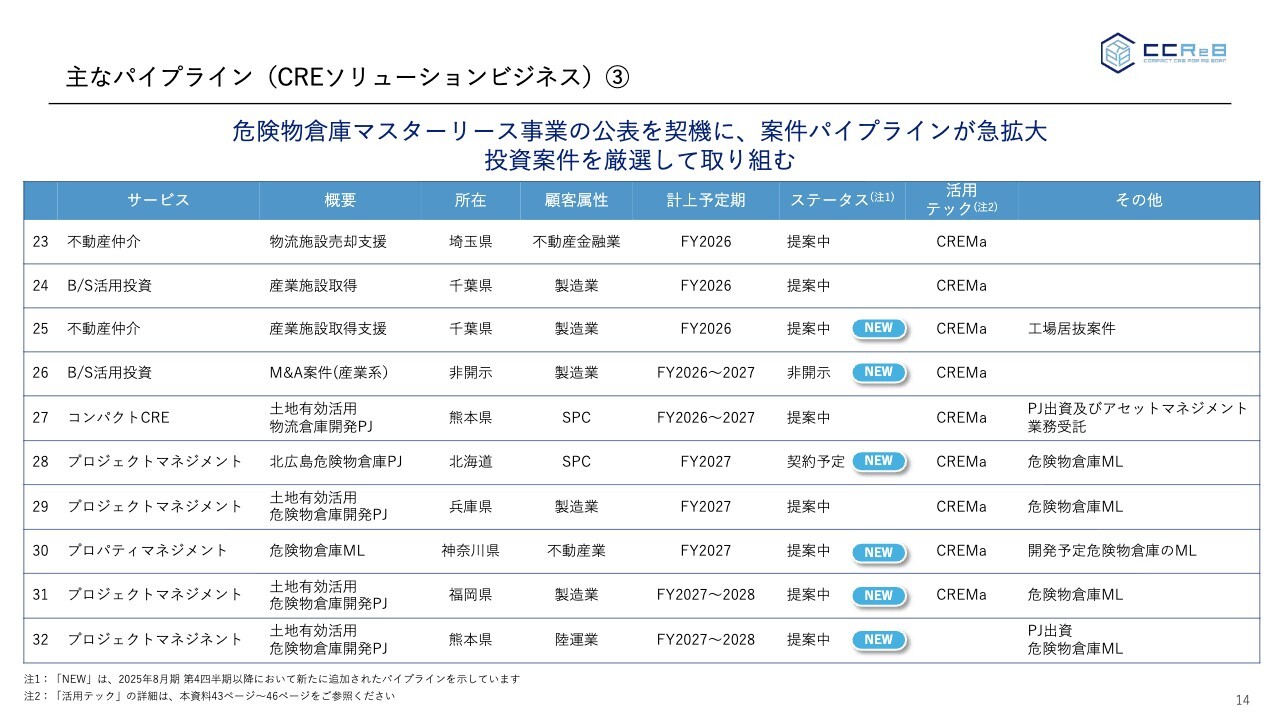 加えて、マスターリースに関しては、先ほど示した北広島市の危険物倉庫のマスターリース事業が2027年度にスタートします。現在はこれに並行し、主要産業エリア、特に半導体やさまざまな技術関連の産業エリアで、2号案件、3号案件の検討を進めています。