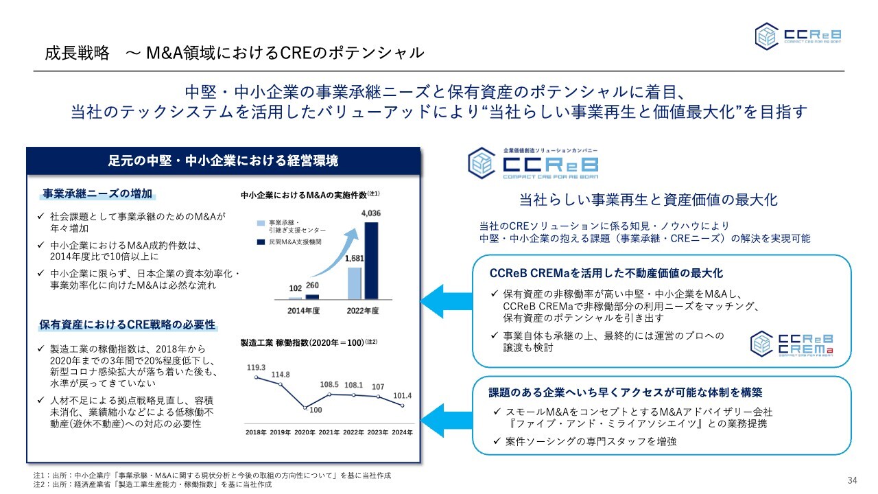 3つ目が、非常に重要なポイントである「CRE×M&A」です。スライド右側に「中堅・中小企業の経営環境を背景とした事業承継ニーズの加速」と記載していますが、これまでもさまざまな案件の申し込みが寄せられてきました。