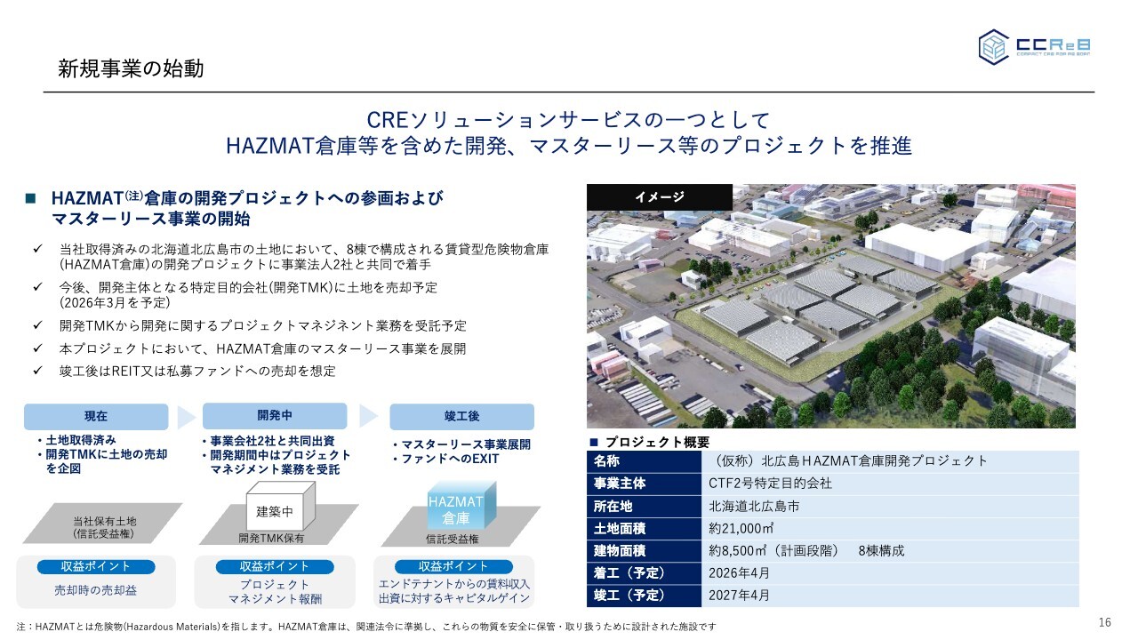 本日リリースした新規事業の始動についてご説明します。従前から北海道北広島市で土地を取得したというお話をしていましたが、こちらにおいてHAZMAT(危険物)倉庫の開発に参画しています。