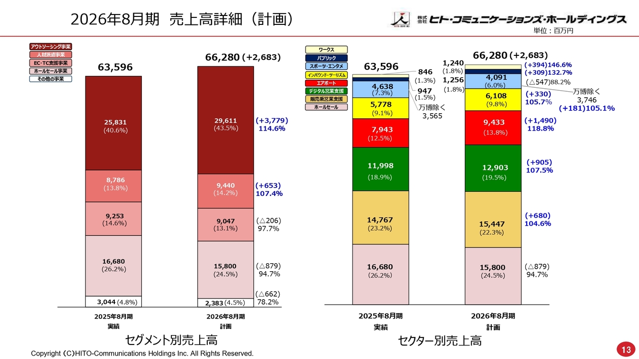 トピックスについてスライド右側に記載しています。まず、最初に挙がっているワークスですが、こちらは物流関連の事業です。この物流事業を新規に立ち上げ、12億4,000万円まで成長を見込んでいます。その結果、前年同期比で3億9400万円増加し、146.6パーセントという成長率を計画しています。また、ほかのセクターについても、グラフをご覧いただくとわかるように、ほぼすべてプラス要因で業績の増加を見込んでいます。