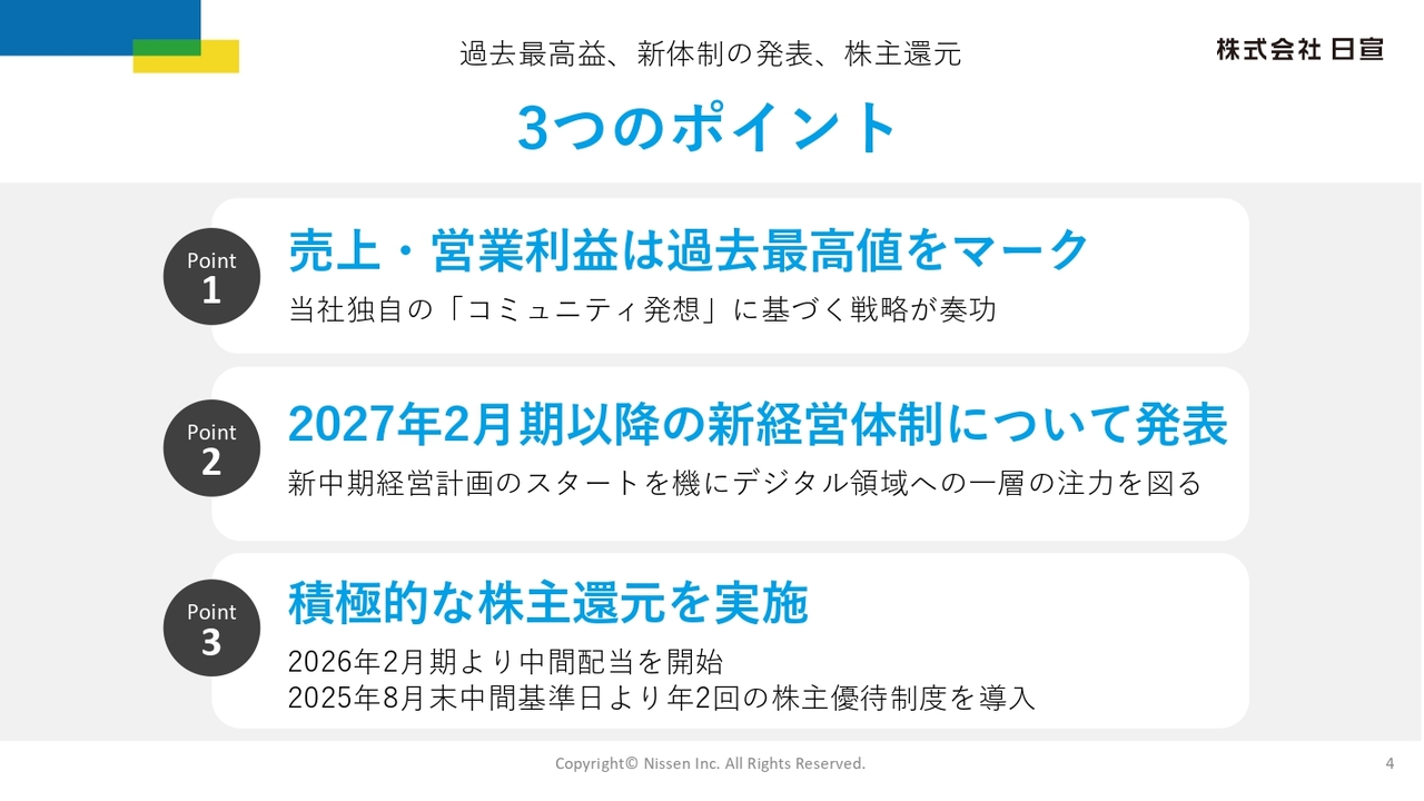 今回の決算のポイントについてご説明します。ポイントは3点あります。