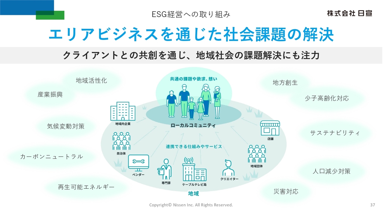 ESG経営への取り組みについてです。当社では、ESG経営の一環として、クライアントとの共創を通じて、地域活性化や地方創生をはじめとする社会課題の解決に取り組んでいます。