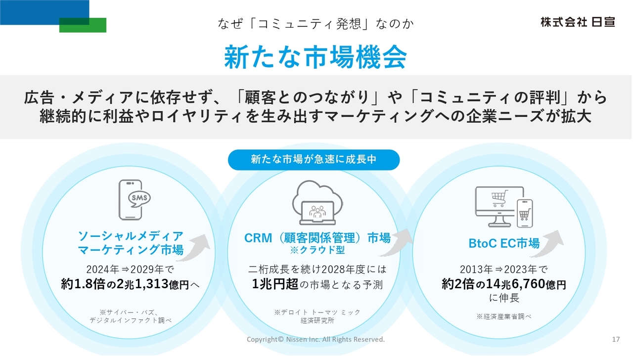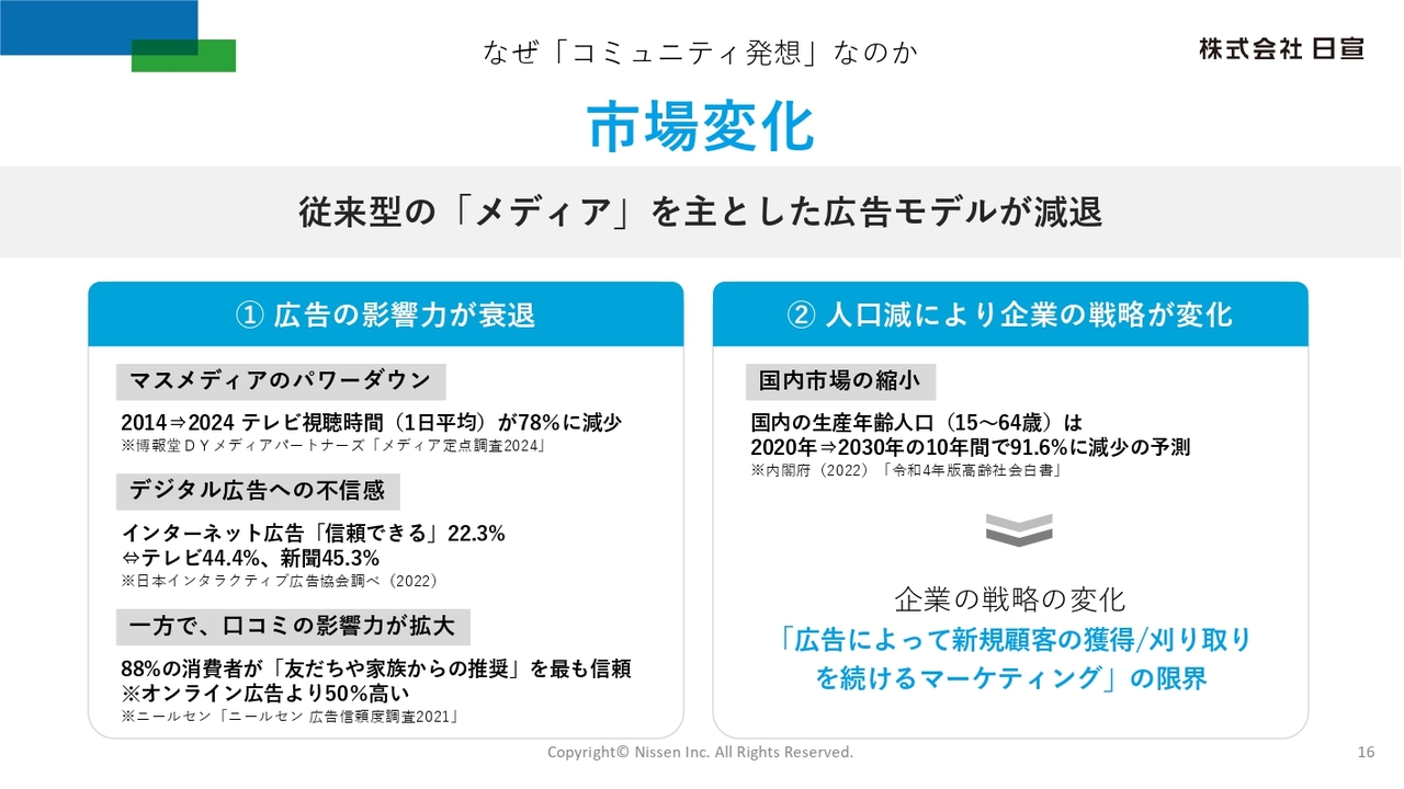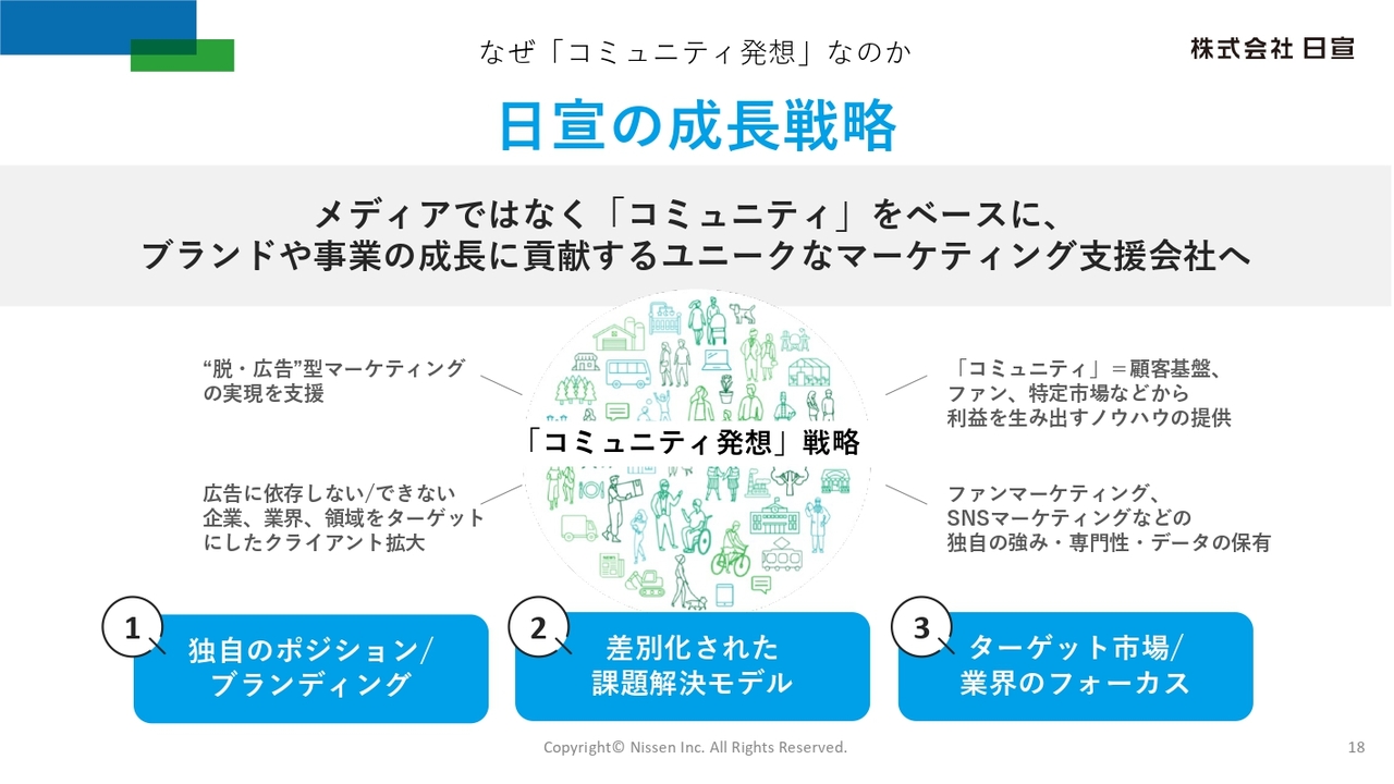 日宣は、このような市場環境の変化を捉え、独立系広告会社という立場から、独自の「コミュニティ発想」に基づく成長戦略を推進しています。