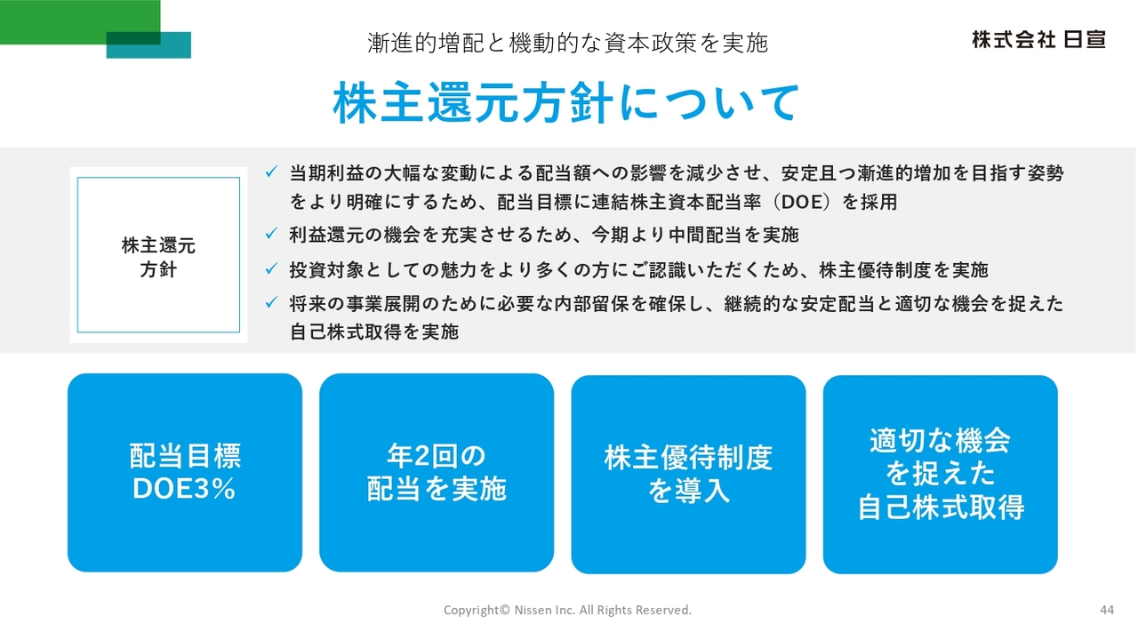 最後に株主還元についてご説明します。当社は株主のみなさまへの利益還元を重要な経営課題と認識しており、配当方針の見直しや中間配当の新設、株主優待制度の導入など、さまざまな株主還元策を実施しています。また、自己株式の取得についても、適切な機会を捉えて実施します。