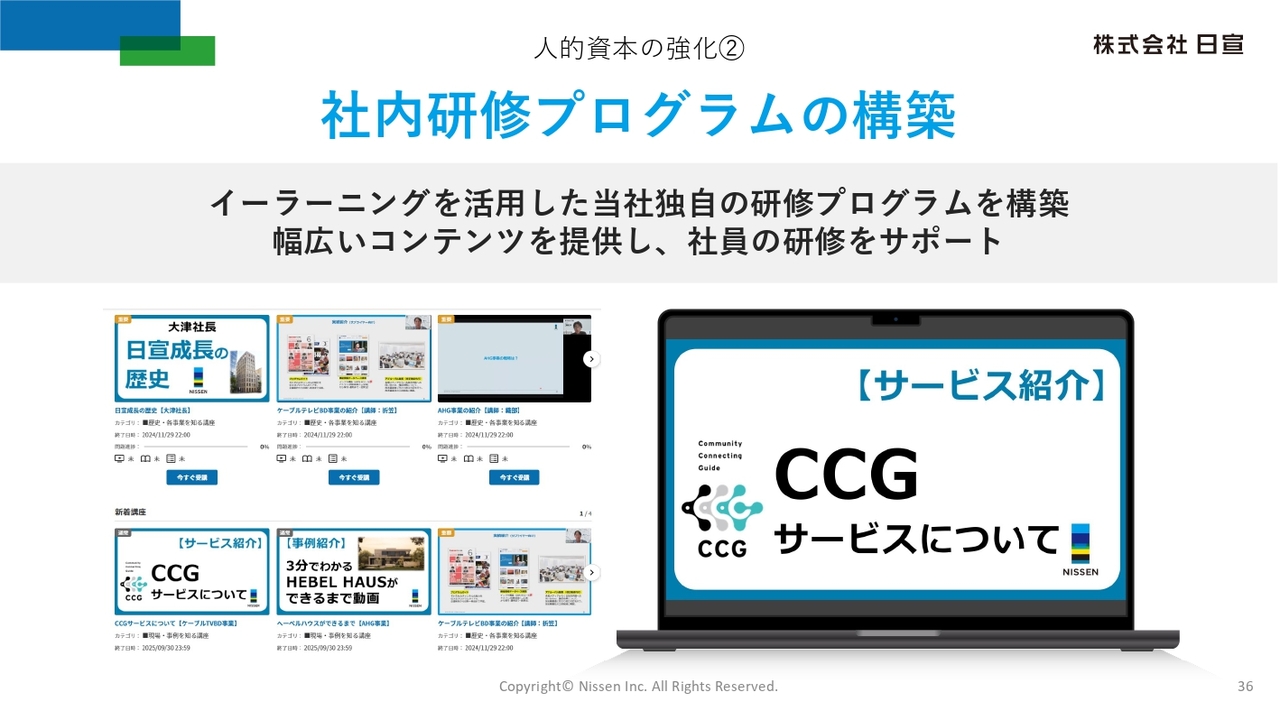 また、当社では、eラーニングを活用した独自の動画研修プログラムを構築しています。コンプライアンスなどの基礎知識から、自社の歴史や事業・サービス内容まで幅広いコンテンツを提供し、社員の事業理解やスキル向上をサポートしています。