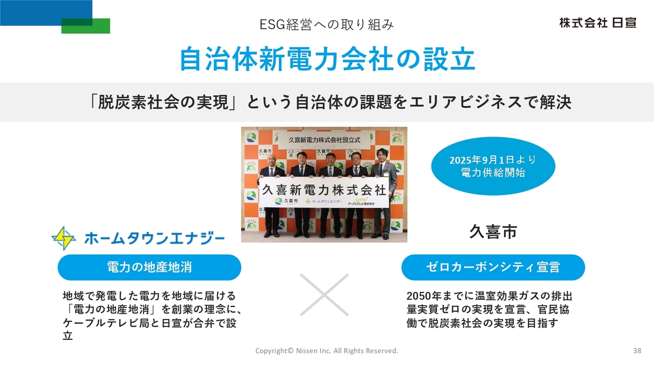その取り組みの1つが、自治体新電力会社の設立です。ケーブルテレビ局との合弁で設立した電力事業会社のホームタウンエナジー社が久喜市と連携し、当社グループ初となる自治体新電力会社である久喜新電力株式会社を2024年11月に設立し、2025年9月より電力供給を開始しました。