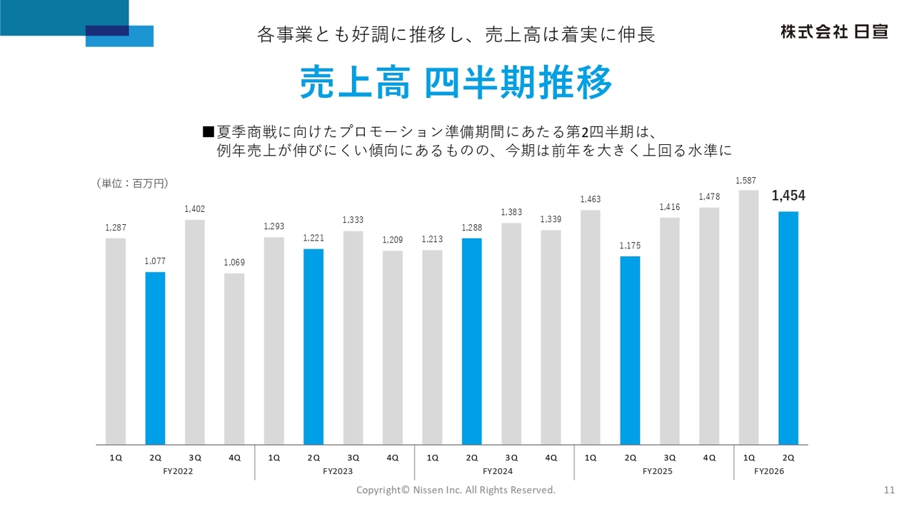 四半期ごとの売上高の推移です。3月決算の顧客からの年度末需要がある第1四半期に対し、第2四半期は例年売上が伸びにくい傾向にあります。しかし、今期は前年を大きく上回り、2億7,900万円の増加となりました。