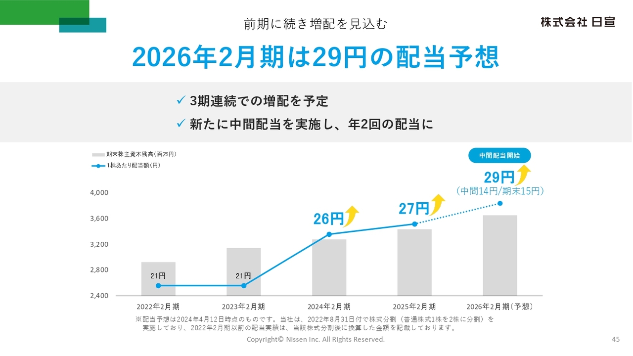 配当については、今期から中間配当を新設し、年2回の配当を行います。中間配当は14円、期末配当は15円を予定しており、通期で29円と3期連続の増配を計画しています。