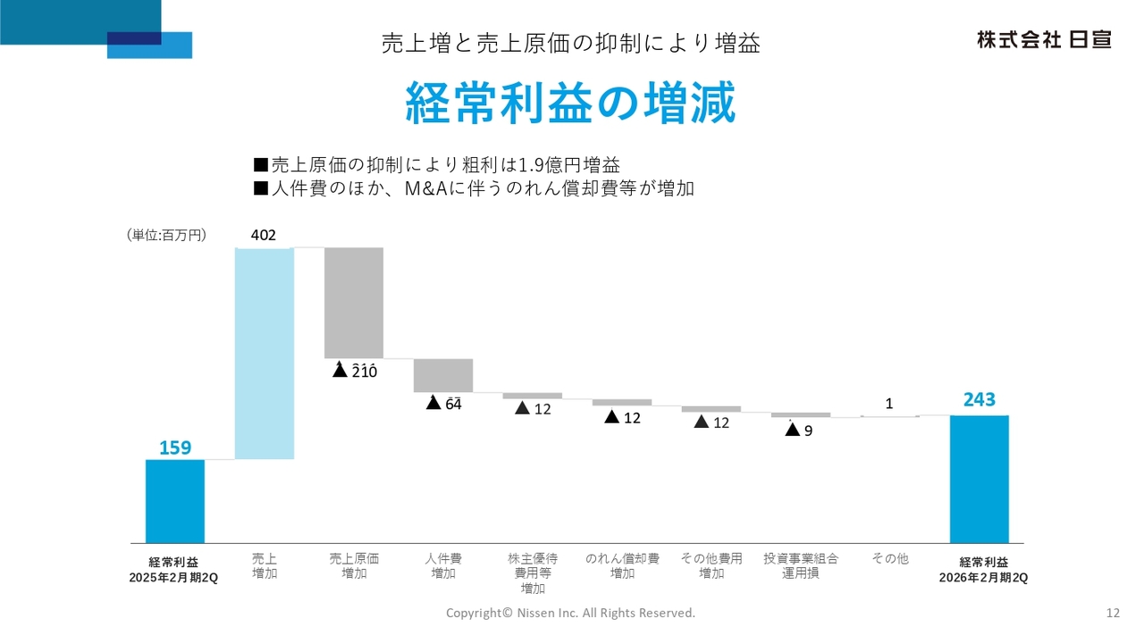 売上高が前年同期比で4億200万円増加したのに対し、売上原価は2億1,000万円増加し、粗利ベースでは差し引き1億9,200万円の増益となっています。