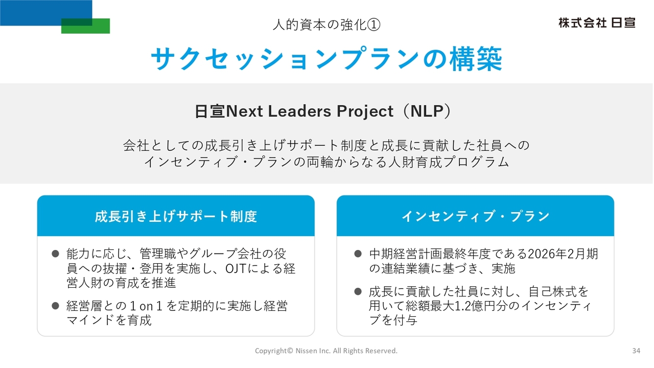 このNLPは、社員の成長を引き上げるためのサポート制度と、成長に貢献した社員へのインセンティブプランを両軸とし、経営人財の育成と成長に貢献した社員に対する、総額最大1億2,000万円のインセンティブを用意しています。