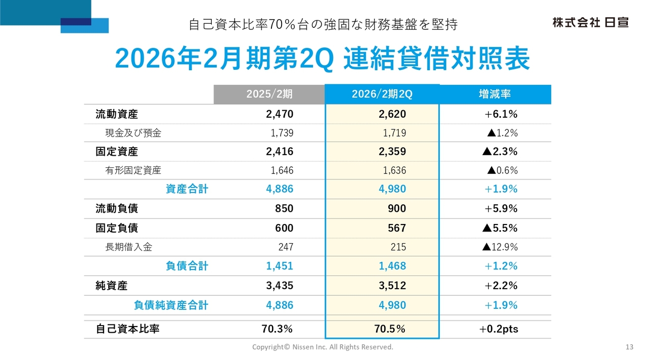 バランスシートについてご説明します。2026年2月期第2四半期末のバランスシートは、資産合計49億8,000万円、負債合計14億6,800万円、純資産合計35億1,200万円、自己資本比率は70.5パーセントとなっています。