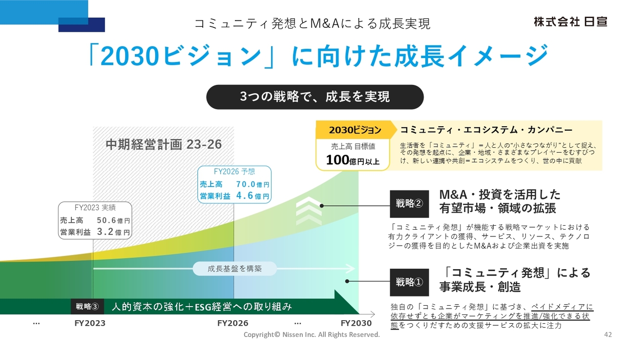 こちらのスライドには、当社が2030年に目指す「2030ビジョン」の実現に向けた成長イメージを記載しています。独自の「コミュニティ発想」に基づく成長戦略を推進し、連結売上高100億円以上の達成と、さらなる成長を目指していきます。
