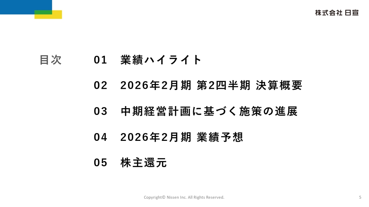 まず、私から当社の事業概要と今回の決算のポイントについてご説明します。その後、経営企画部長の中角から決算数値の詳細、中期経営計画に基づく施策の進展、通期の業績予想、株主還元について、それぞれ資料に沿ってご説明します。