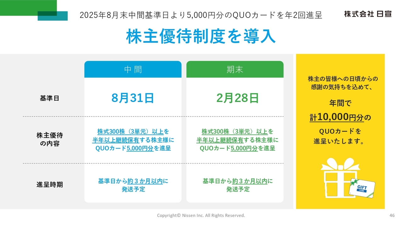また、今期より株主優待制度を導入しました。毎年8月末と2月末を基準日とし、300株以上を半年以上継続保有する株主さまに、5,000円分のQUOカードを年2回、合計1万円分進呈します。このように積極的な株主還元を行うことで、投資対象としての魅力を高めていきます。