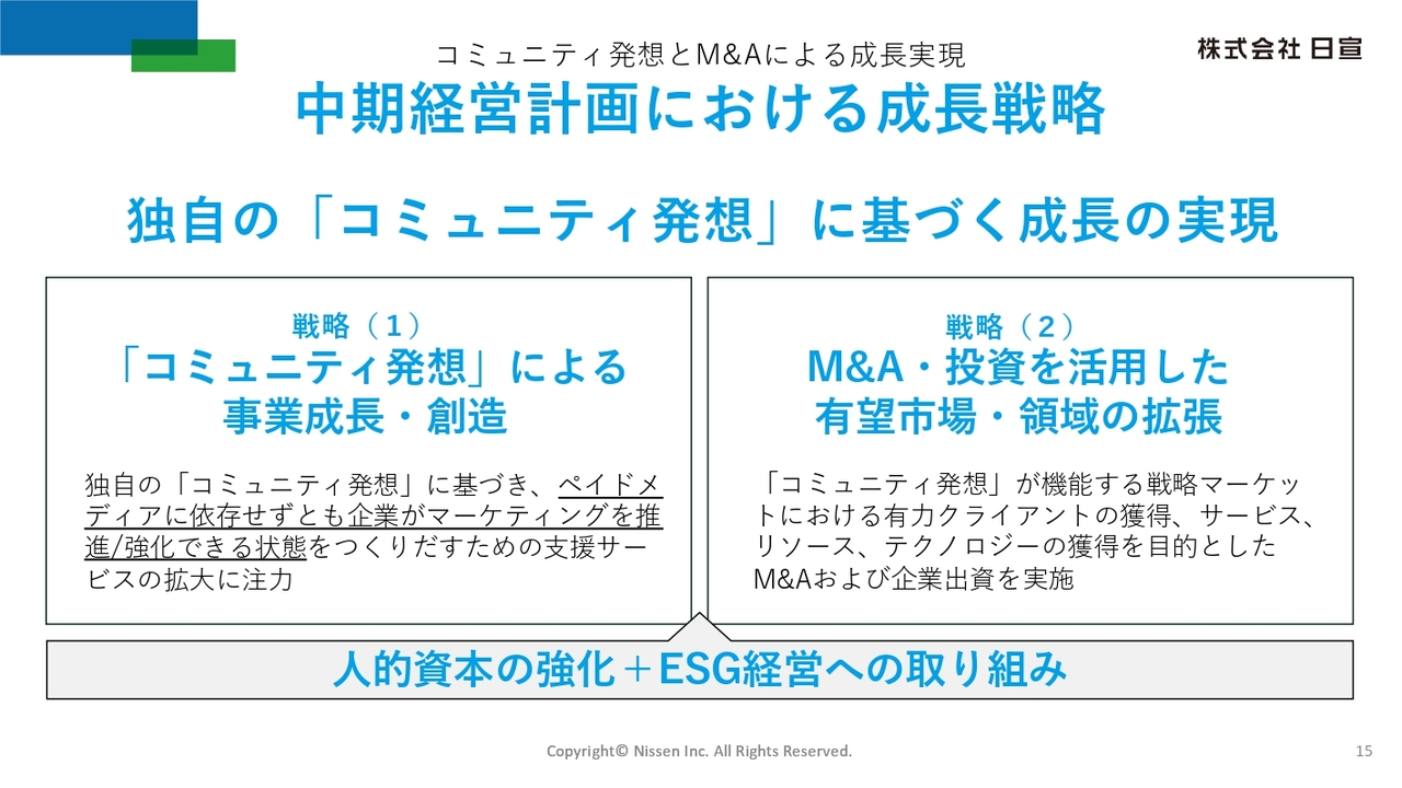 中期経営計画における成長戦略は、独自の「コミュニティ発想」に基づく成長の実現です。事業成長・創造とM&A・投資の2つを成長戦略の軸とし、それらを支える3つ目の戦略として、人的資本の強化とESG経営への取り組みにも注力します。