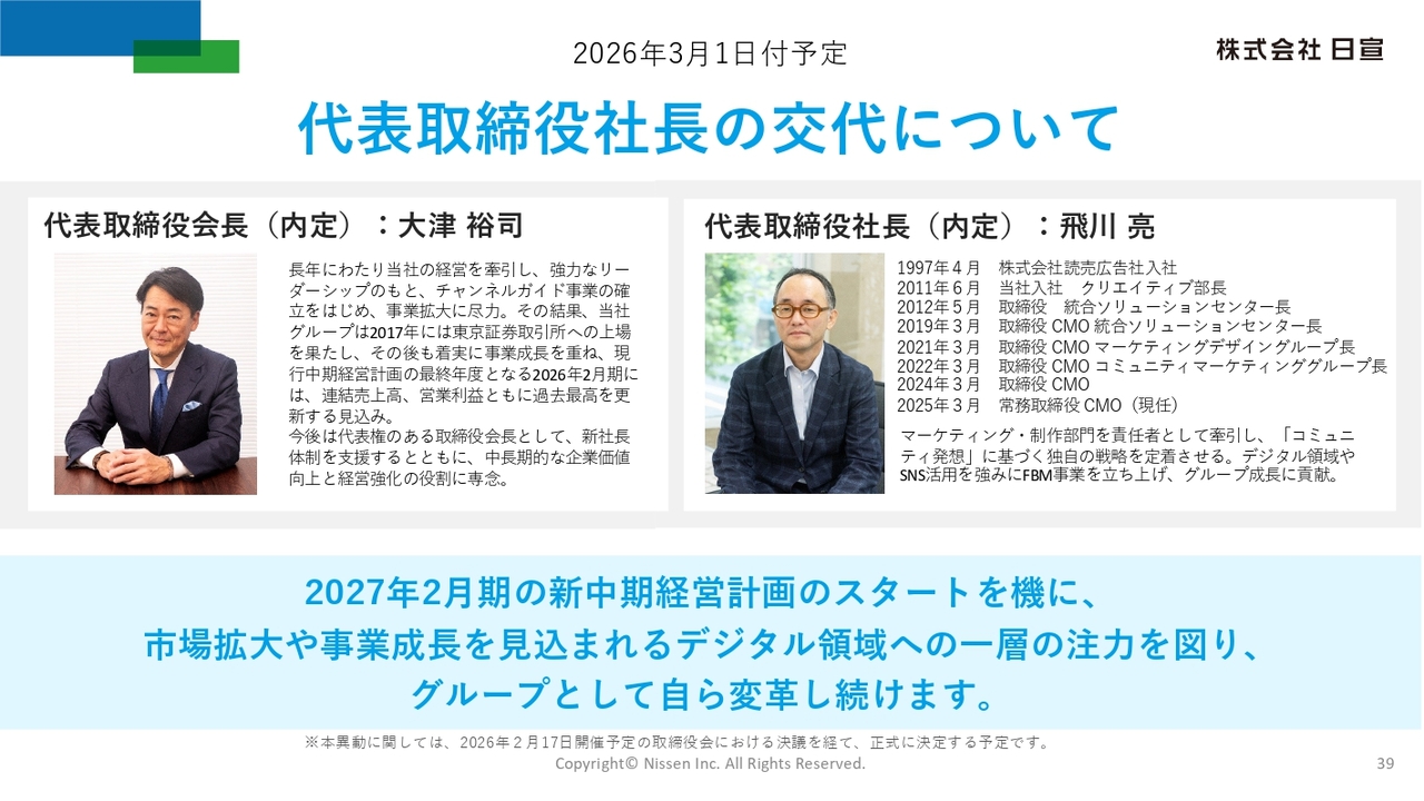 2点目は、2027年2月期以降の新経営体制についての発表です。時代の変化に対応し、会社の変革を進めるため、現行中期経営計画が終了する今年度末をもって経営トップの交代を決断しました。