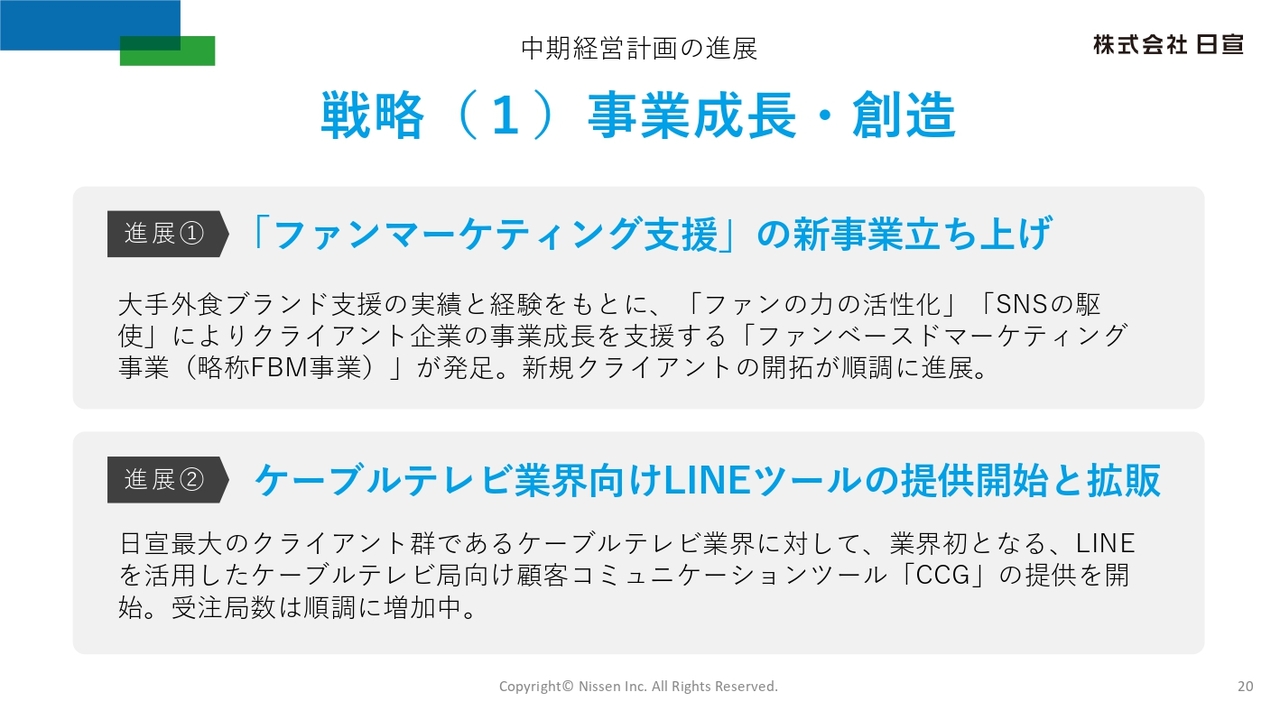 1つ目の戦略である「コミュニティ発想」による事業成長・創造の推進成果は、ファンマーケティング支援の新事業立ち上げ、ならびにケーブルテレビ業界向けLINEツールの提供開始および拡販です。