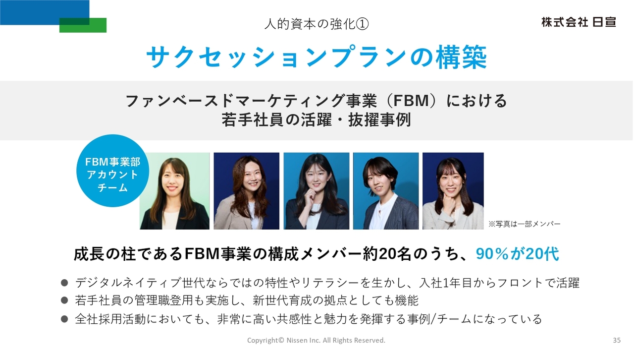 若手社員の活躍や抜擢事例についてご説明します。FBM事業の構成メンバー約20名のうち、90パーセントが20代であり、デジタルネイティブ世代ならではの特性やリテラシーを活かし、入社1年目から活躍する社員も多数います。