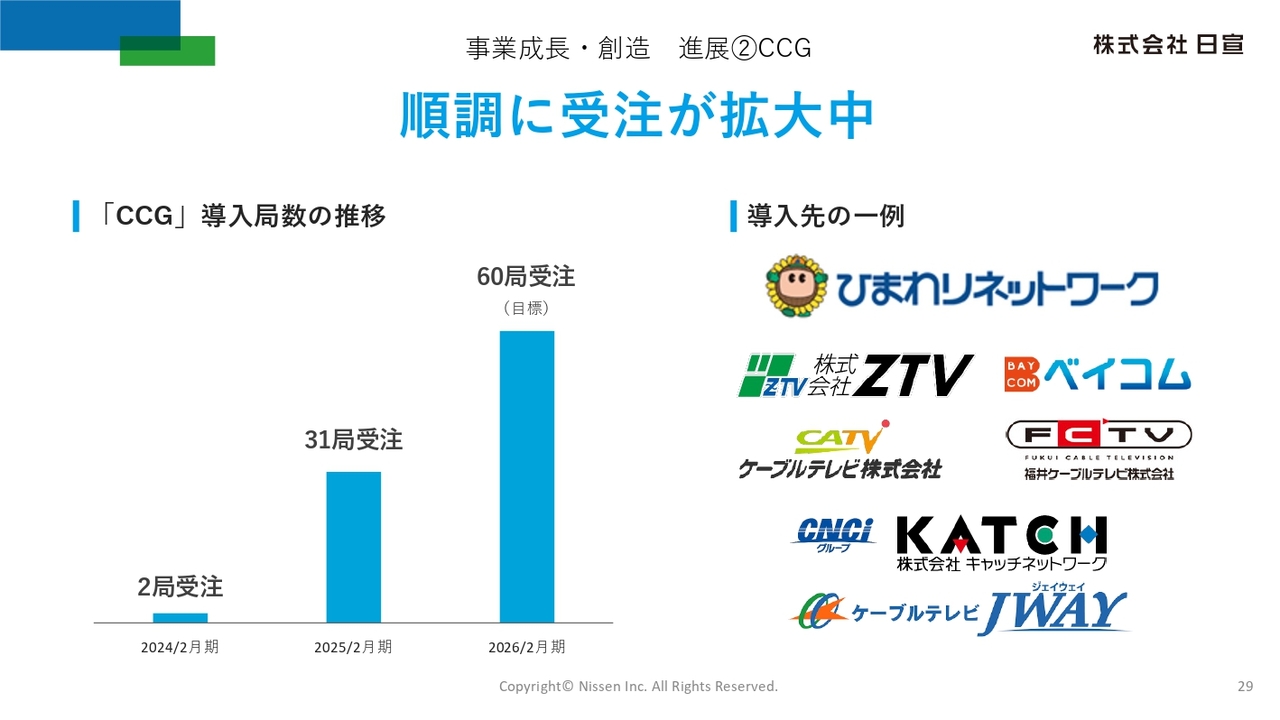 ケーブルテレビ各局における「CCG」の導入状況はスライドのとおりです。2026年2月末までに60局の受注を目指し、営業活動やコンテンツのアップデートに注力しています。