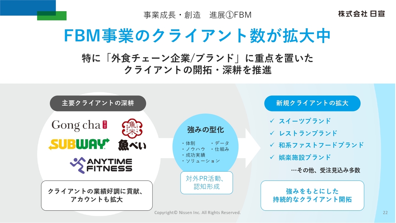 現在、特に外食チェーン企業やブランドを中心に、FBM事業のクライアント数が拡大しています。当社が支援している主要クライアントは業績が好調で、こうした成功実績を積み上げる中で、その強みを型化し、強みに基づく持続的なクライアント開拓を推進しています。