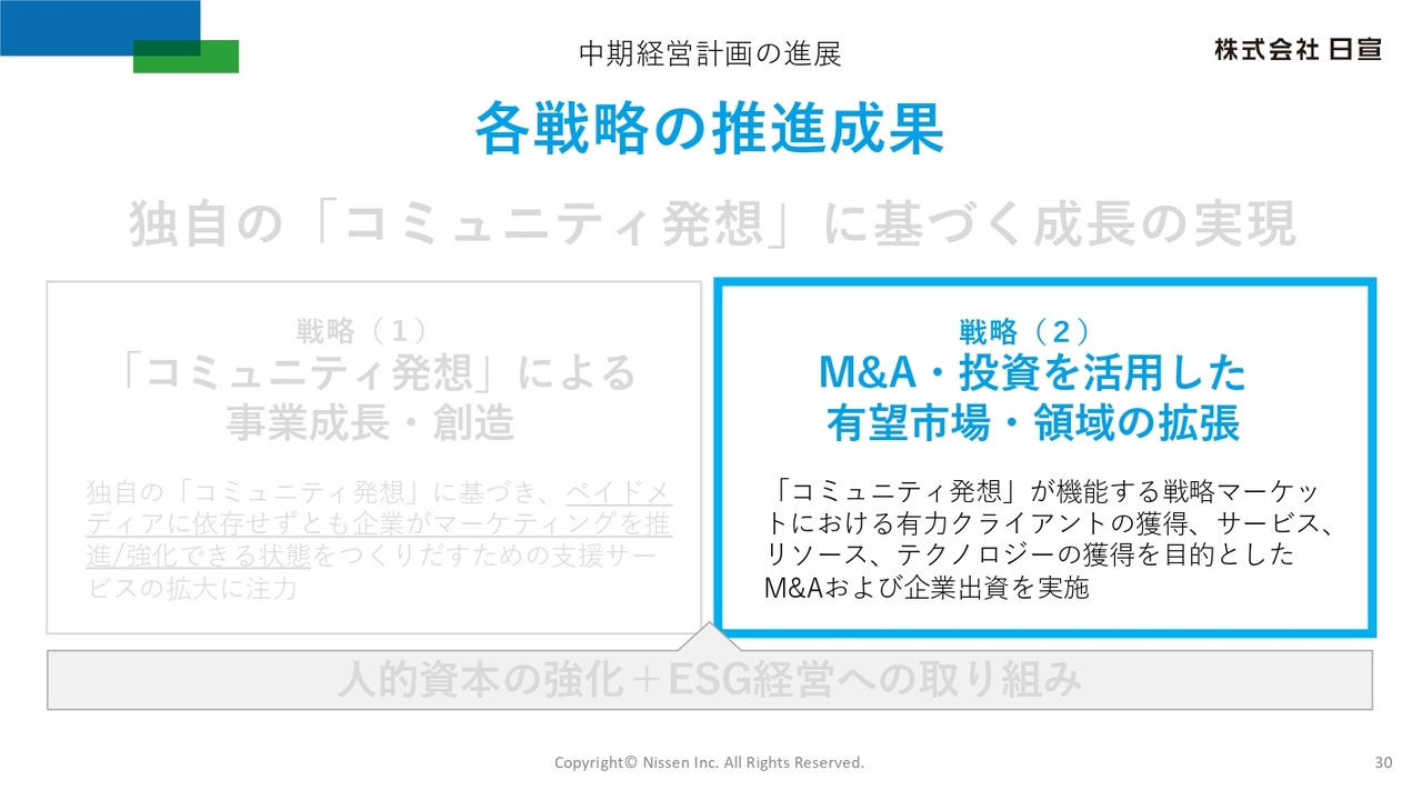 2つ目の戦略であるM&A・投資を活用した有望市場・領域の拡張では、「コミュニティ発想」が機能する戦略マーケットにおける有力クライアントの獲得、およびサービス、リソース、テクノロジーの獲得を目的としたM&Aや企業出資を実施していきます。