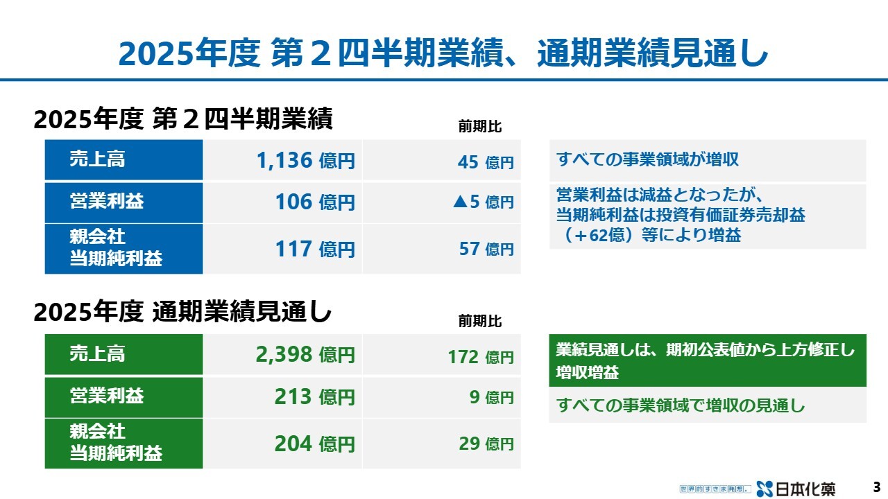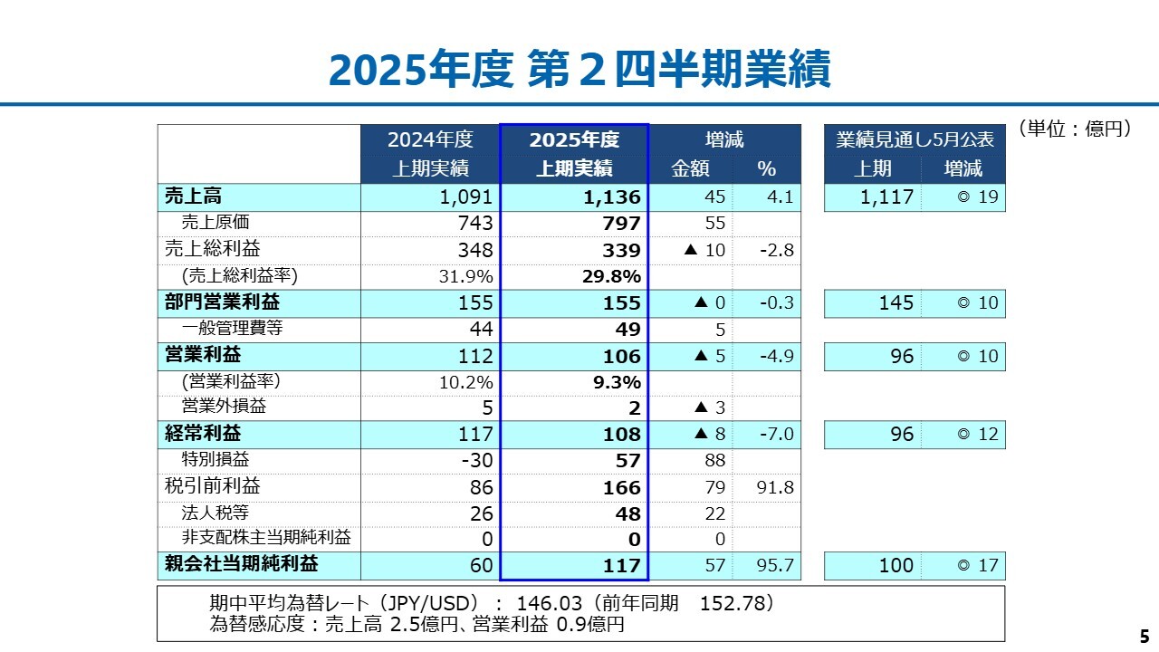 2025年度第2四半期の業績および通期の業績見通しの数字について簡単にご説明します。スライド上段は、2025年度第2四半期の業績です。売上高は1,136億円で、前期比45億円の増収となっています。すべての事業領域で増収を達成しました。