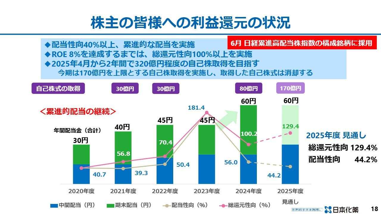 今年度は、配当性向が44.2パーセント、総還元性向が129.4パーセントとなる見通しです。配当金は昨年同様、1株あたり60円を維持する予定です。