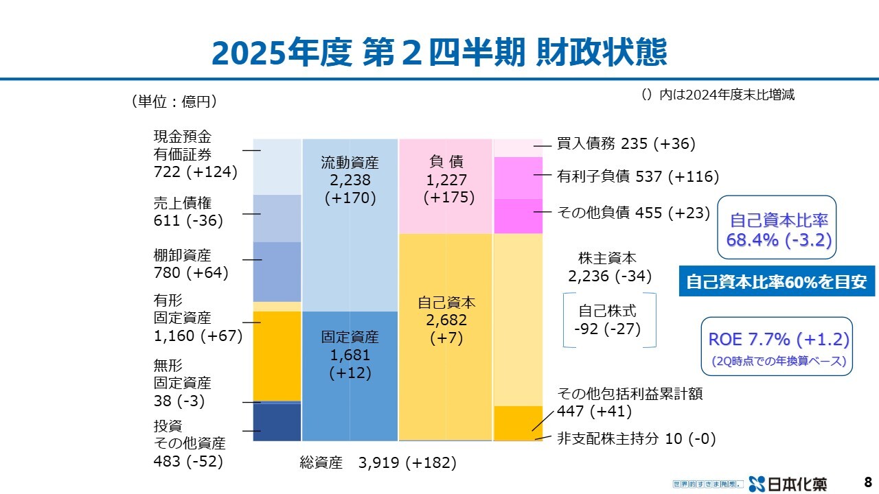 B/S、財政状況です。総資産は3,919億円で、前年度末比でプラス182億円となっています。主な増加要因としては、現預金・有価証券が前年度末から124億円増加し、722億円となりました。棚卸資産も前年度末から64億円増加し、780億円となっています。