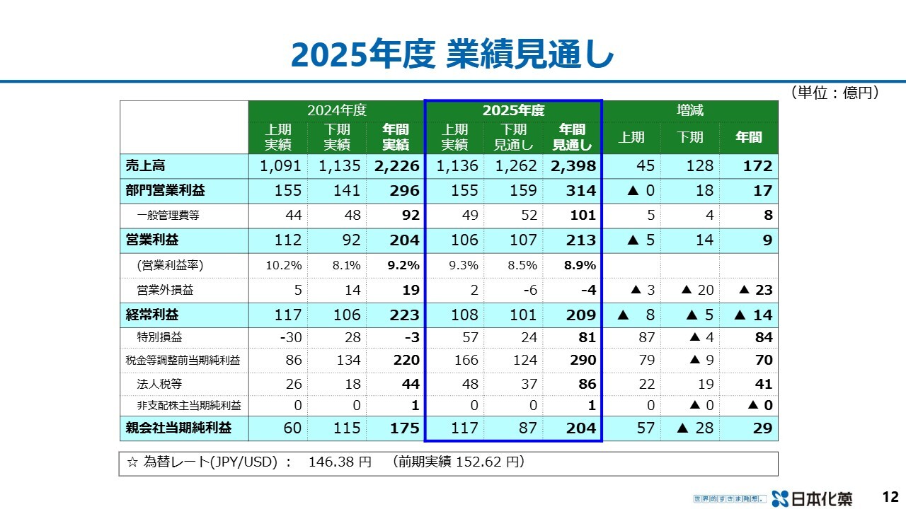 今年度の業績見通しです。スライドには、上期実績、下期見通し、年間見通しの順に記載しています。