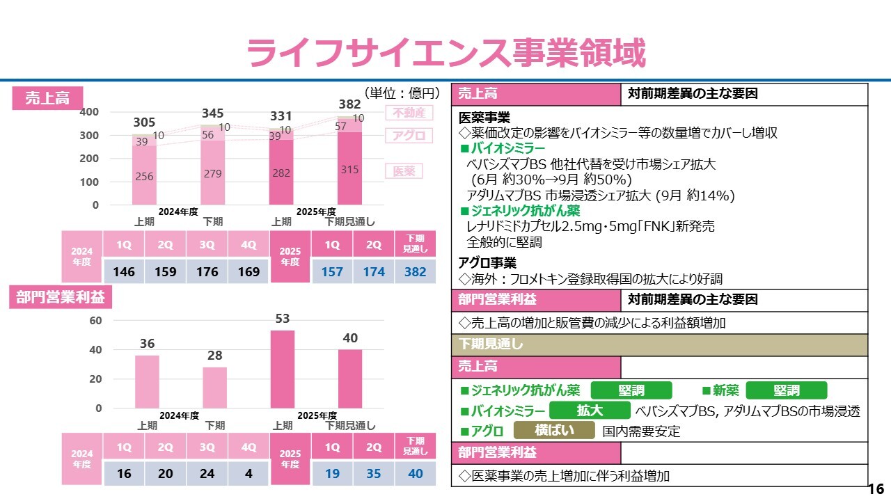 下期見通しとしては、売上高はジェネリック、バイオシミラー、新薬ともに堅調に推移する見込みです。一方で、アグロ事業はほぼ横ばいと予測しています。