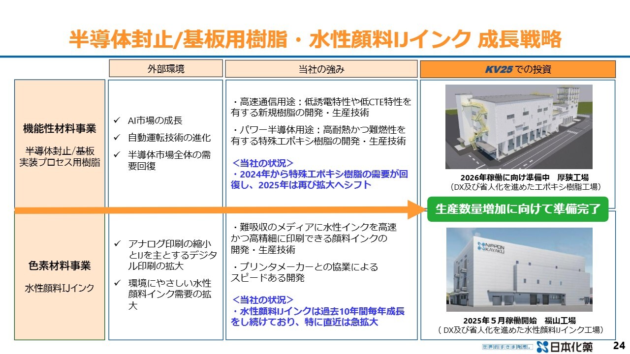 このように、機能性材料事業に関しては、半導体関連のエポキシ樹脂や、半導体周辺の製造装置、クリーナー等の生産体制を整備し、今後の事業拡大につなげていく方針です。