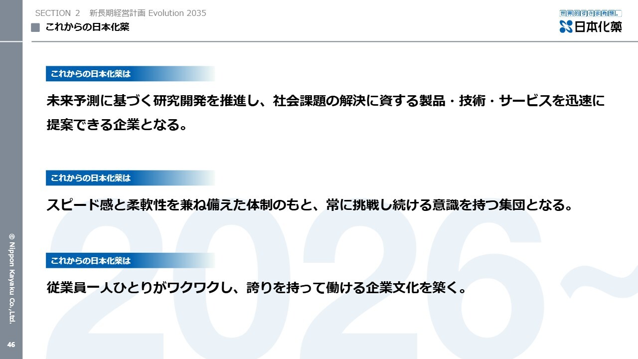 本日は多くのご質問をいただきましたが、十分ご満足いただけるお答えができなかった部分もあったかと思います。今後、「新生」日本化薬が2026年から2035年に向けて、これまでとは異なる日本化薬をお見せできるよう取り組んでいきます。