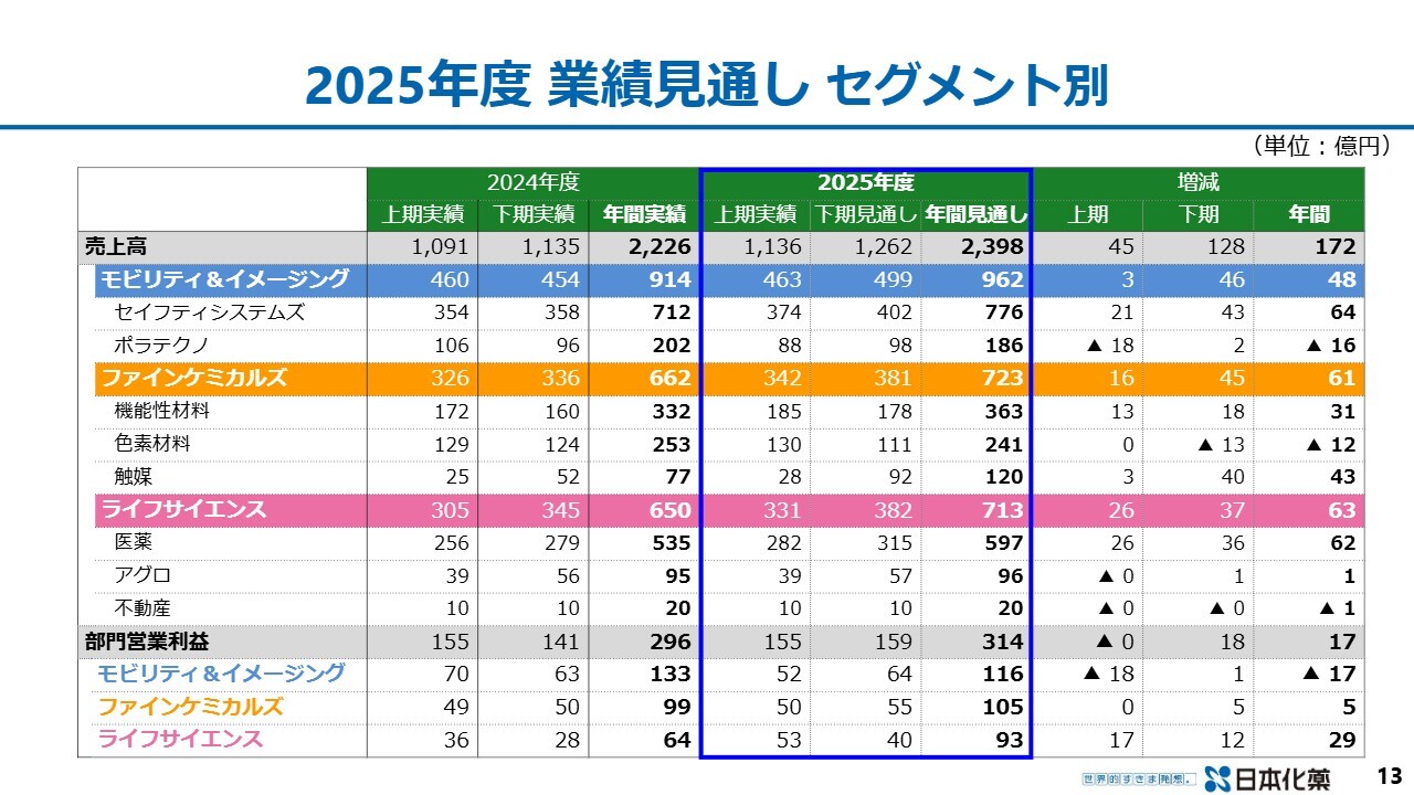ファインケミカルズ事業領域では、機能性材料事業が363億円で31億円の増収、色素材料事業が241億円で12億円の減収を見込んでいます。触媒事業は下期にかなり集中しますが、120億円で43億円の増収を見込んでいます。