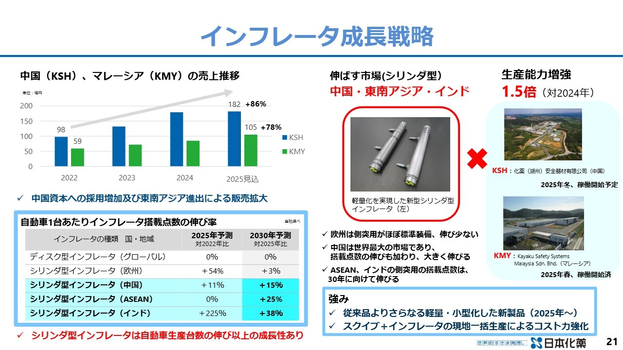 スライド右側の写真にあるとおり、大きく成長する市場である中国、東南アジア、インドに向けて、軽量化を実現した新型インフレータを拡販していきます。