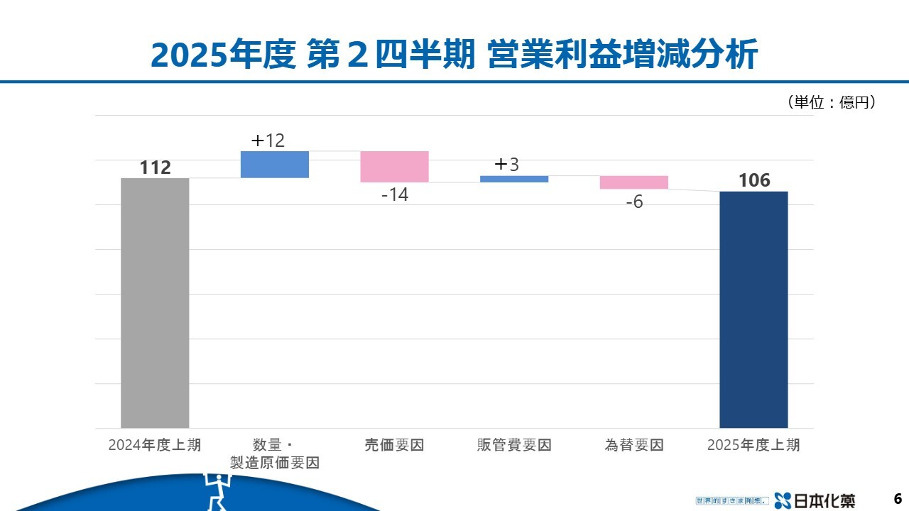 数量増が主な要因で12億円のプラスがありました。医薬品の薬価改定などが毎年行われている影響で、売価要因で14億円のマイナスが発生しました。販管費では有利差異がプラス3億円出ています。為替要因で6億円のマイナスがありました。