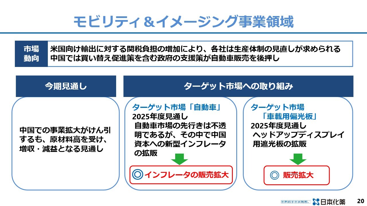 モビリティ&イメージング事業領域におけるターゲット市場への取り組みについては、スライド右下に記載のとおりです。1つ目に、セイフティシステムズ事業では、自動車業界をターゲット市場とし、特に中国資本のお客さまに向けた新型インフレータの拡販を進めたいと考えています。