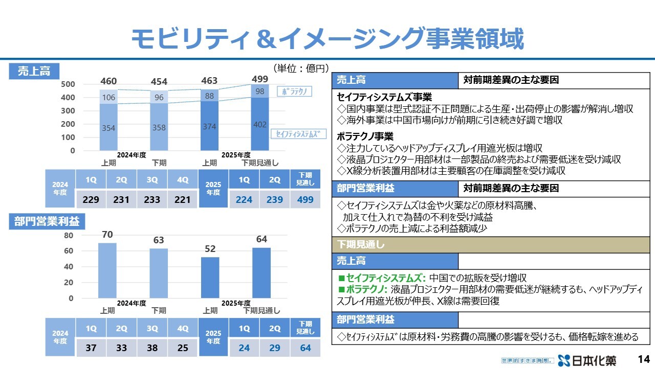 モビリティ&イメージング事業領域では、セイフティシステムズ事業は年間見通しが776億円で、64億円の増収、ポラテクノ事業は186億円で16億円の減収を見込んでいます。