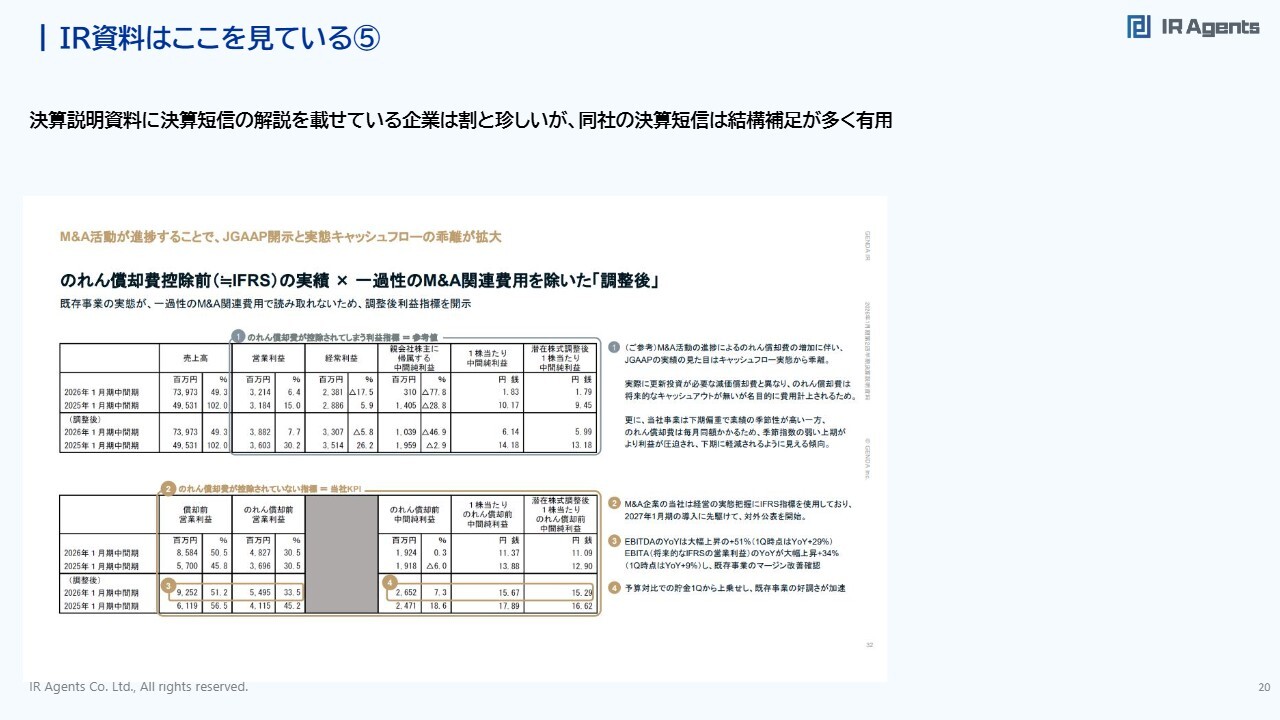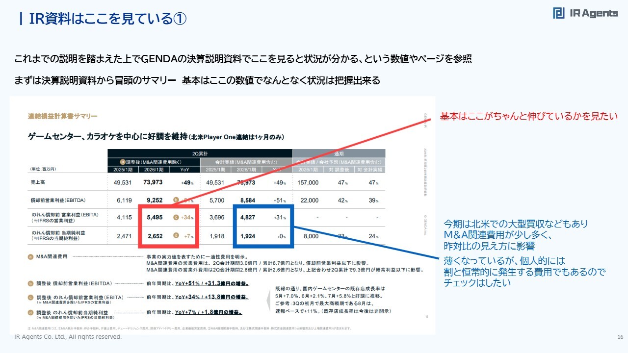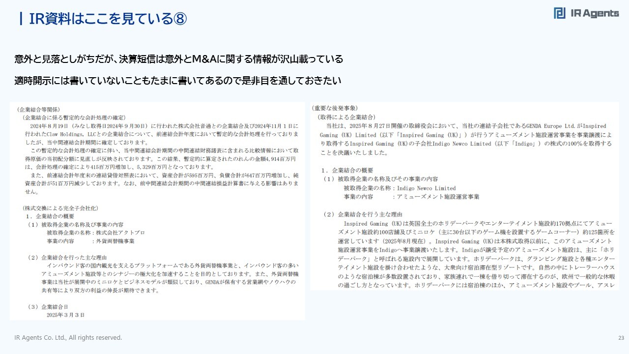 関本:ここまで、M&A企業に対して、私がどのような視点でどのような指標を見ているのかについて、GENDAを例にとってご説明しました。ここからは、IR資料のどこを見ているかというお話をしたいと思います。