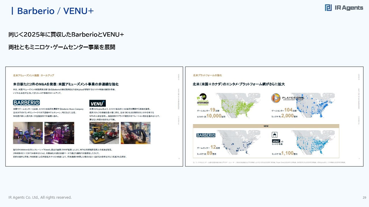 関本:同じく今期に買収したBarberioとVENU+は、いずれもミニロケ事業とゲームセンター事業を展開しています。