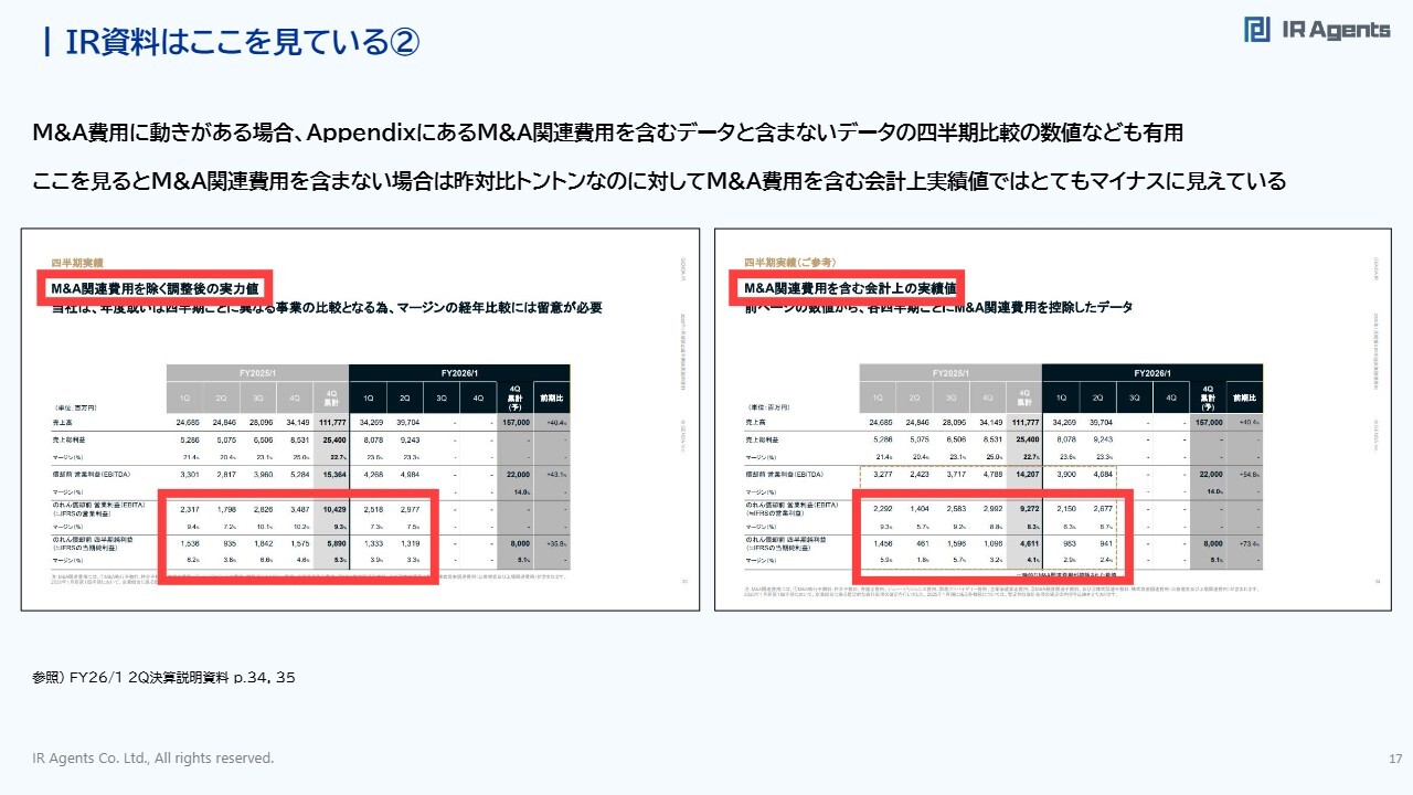 関本:M&A費用で大きな動きがある場合、資料後半のAppendixに「M&A関連費用を除く調整後の実力値」や「M&A関連費用を含む会計上の実績値」が記載されています。