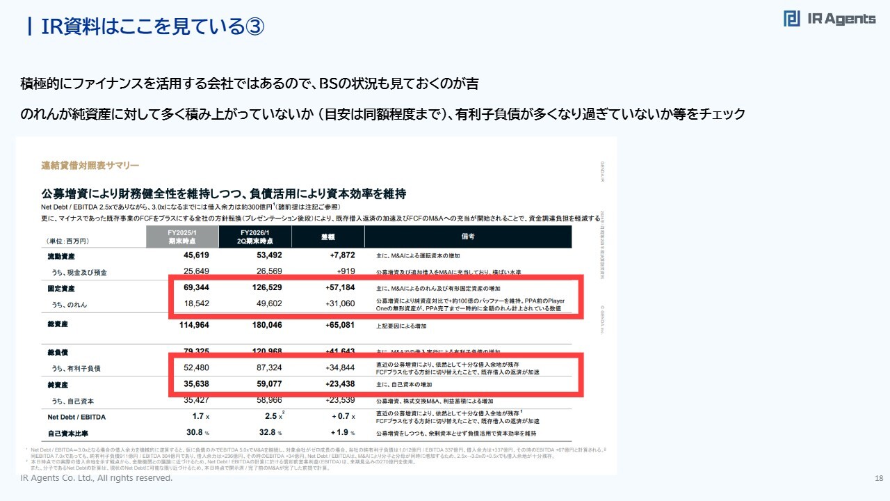 関本:GENDAは積極的にファイナンスや買収を行う会社のため、貸借対照表の指標も確認しています。特に、スライドの表中の赤枠で囲んでいる「固定資産」と「のれん」の金額、そして総負債の中の「有利子負債」と「純資産」の金額の4つを見ておけば大丈夫だと思います。