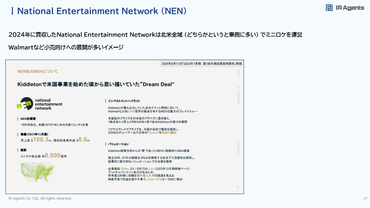関本:National Entertainment Network(NEN)は、GENDAが2024年に買収した企業です。北米全域でミニロケを中心に運営しており、Walmartなど小売向けへの展開が多いという情報がありました。