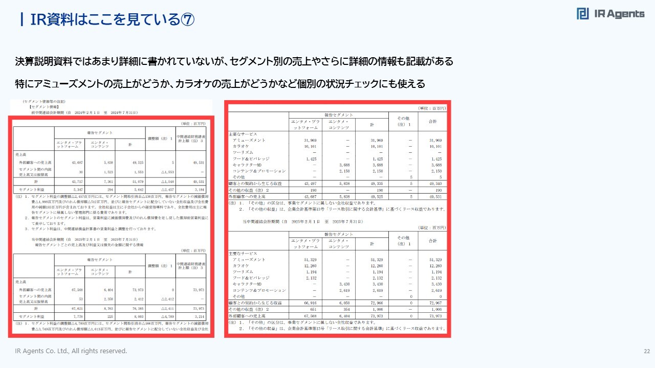 例えば、エンタメ・プラットフォームのアミューズメントやカラオケの売上などが決算短信には書いてあるため、より詳細を知りたい人は、このようなところを見るのも良いと思います。