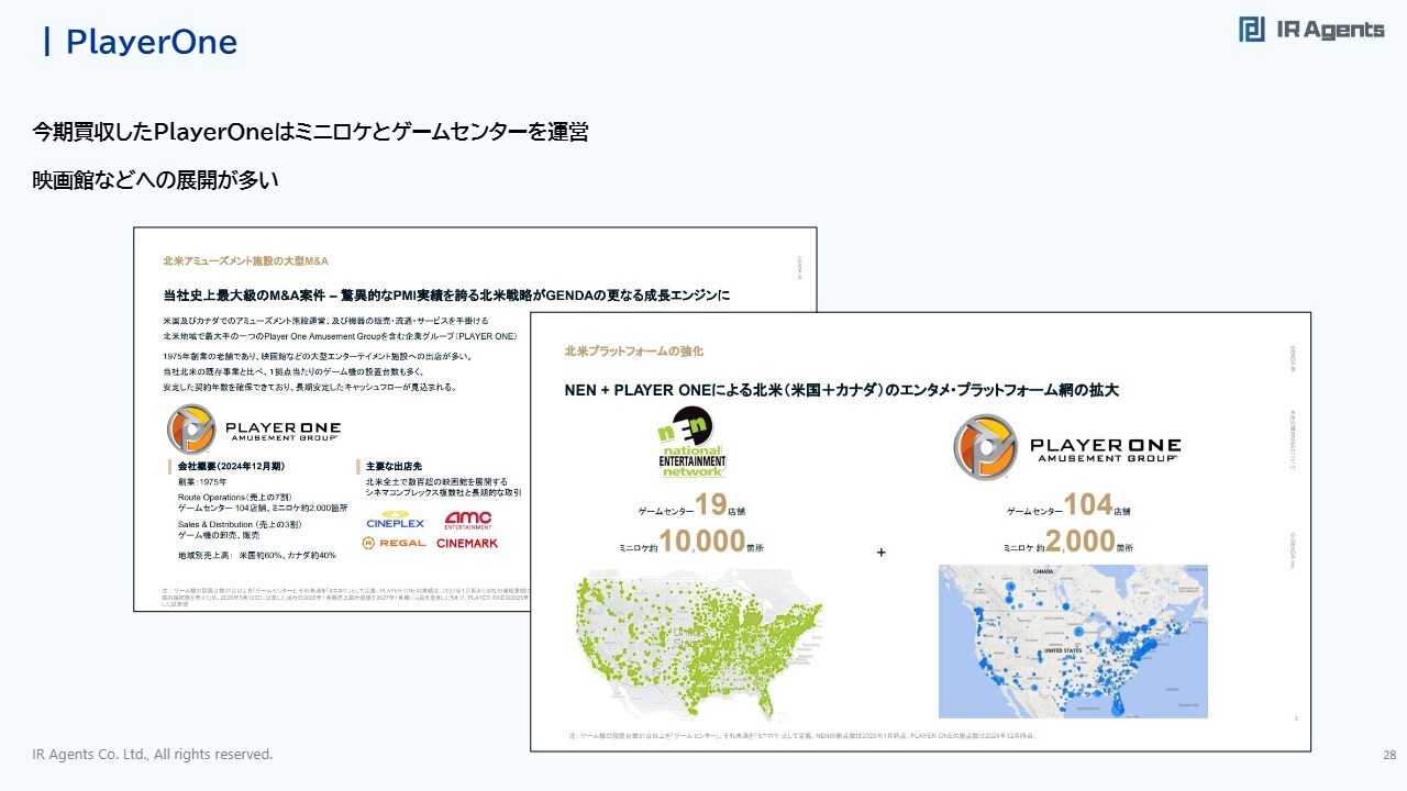 関本:今期買収したPlayerOneは、ミニロケとゲームセンターを運営しています。NENよりも規模感が大きい印象で、こちらは映画館などへの展開が多いようです。